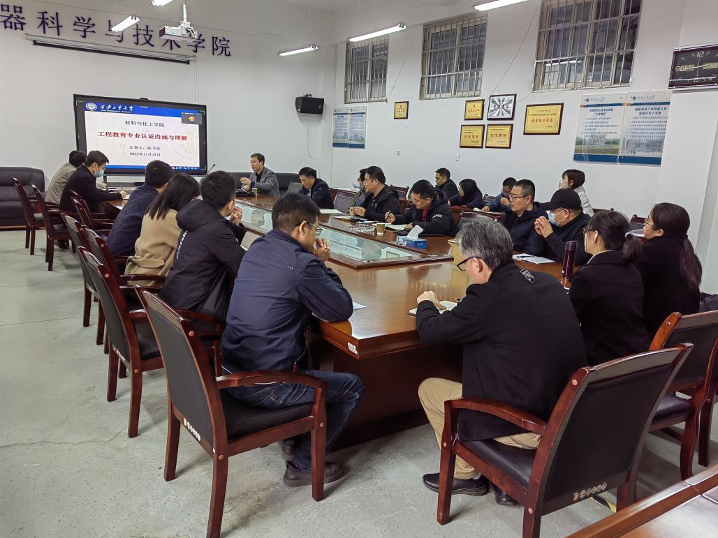 邀请工程教育专业认证专家,材料与化工学院陈卫星教授进行专题培训活动,会议由教学院长蔡长龙主持,学院院长郭永春,学院教学骨干教师参加此次培训活动。