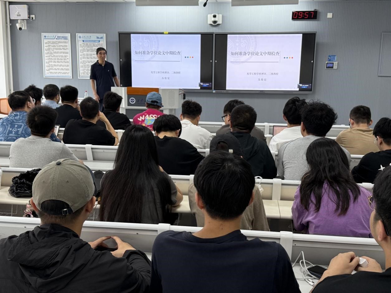 在教9-319教室成功举办了“关于学位论文中期检查的思考”专题讲座。本次讲座特别邀请到苏俊宏教授担任主讲嘉宾,60余名研究生到场聆听。