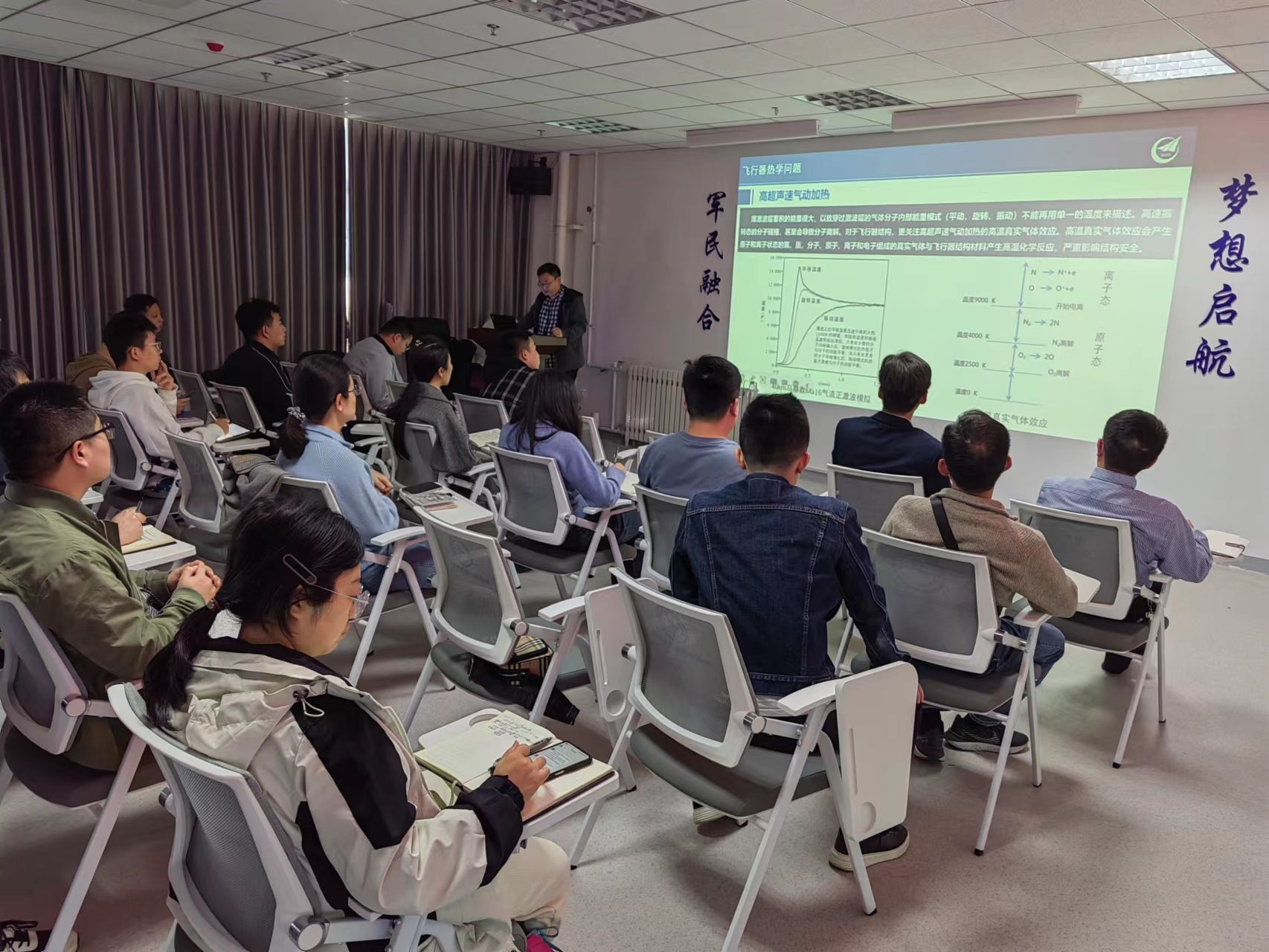 王振亚高工从飞行器在大气层中高速飞行时气动加热带来的热学问题谈起,探讨了高速飞行器气动加热的产生及防护的主要措施,并介绍了高速飞行器热防护领域未来的发展方向,与会教师与王振亚高工进行了深入讨论。