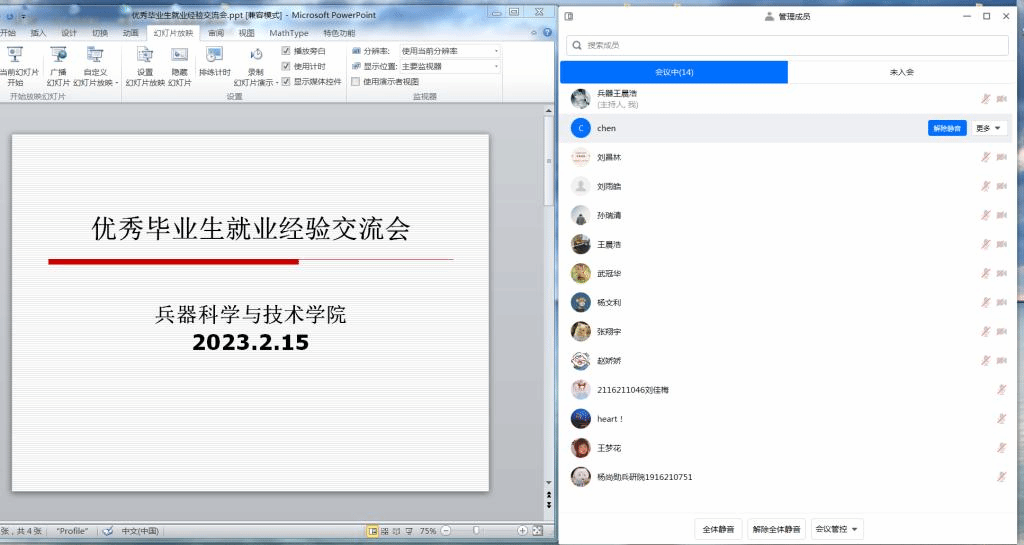 于2月15日开展了朋辈帮扶就业指导经验交流会,邀请了2022届毕业研究生校友王梦花、杨尚勋分享就业经验,全体硕士研究生及研究生辅导员王晨浩参加了会议。