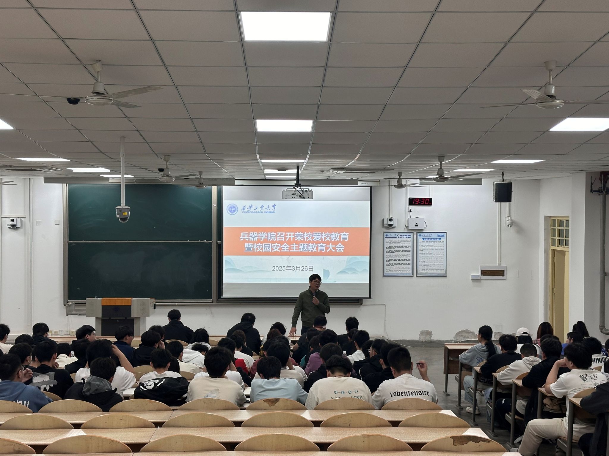 接下来,王国栋向大家阐述了校园安全存在的问题,从人身安全防护、电信诈骗识别、公共场所防盗、非法卖血危害,到消防安全管理和食品卫生保障等方面进行了详尽讲解。特别强调了规范化请假制度的重要性,并语重心长地指出:"安全是发展的基石,同学们必须时刻绷紧安全这根弦,切实守护好生命财产安全这道防线。"提醒同学们要树立好安全意识,切实的保护好自身生命与财产安全。