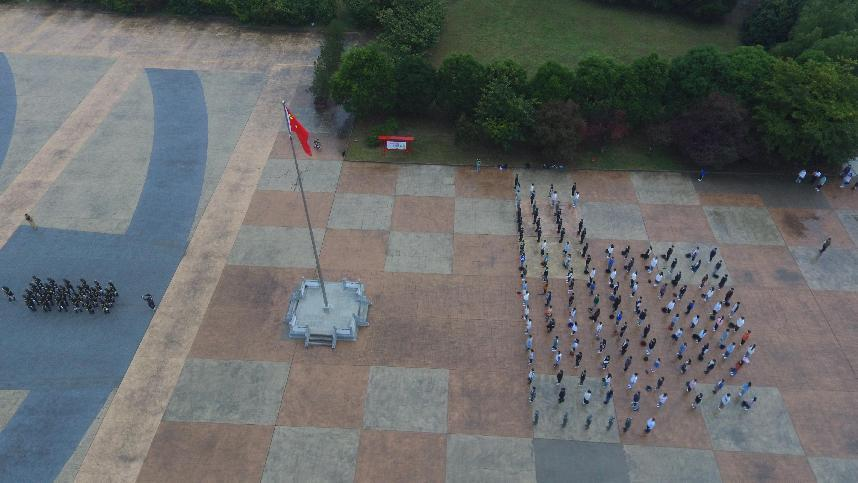 组织学生在经纬广场观看升旗仪式。