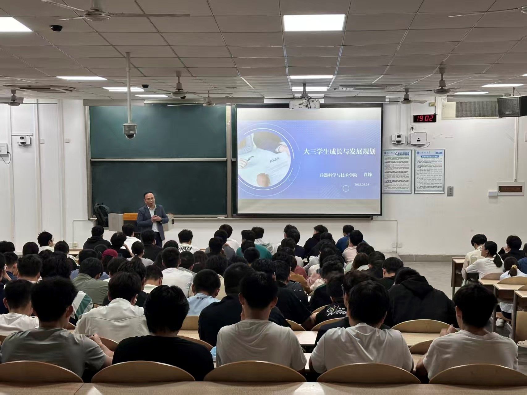 肖锋从大三定位、专业学习、未来规划三个方面入手,首先指出了大三在大学四年以及人生中的重要性,面临着就业、升学的道路选择,希望同学们进一步明确自己的规划,并邀请杜鑫与赵婧臣两位同学和现场同学分享了自己的未来人生规划。随后,肖锋强调大三的专业课学习要从专业核心知识的强化与知识体系的拓展两个方面展开,主动去寻求资源提升学习内驱力,变“被动接受”为“主动深耕”。讲座中,肖锋结合自身丰富的学术和工作经验,向同学们介绍了兵器专业本科生职业发展和考研深造的现实情况,这不仅帮助同学们洞察自身专业的就业前景与发展脉络,更促使大家在大学重要的阶段中能够全力以赴地投入到学业与实践,为将来的职业生涯做好全方位准备。最后,在总结与交流环节,肖锋寄语同学们永远保持阳光的心态,保持自信,坚持“大三不犹豫,未来不后悔”的信念,明确方向,主动利用、寻找资源,并承诺学院将全程为学生的成长保驾护航。