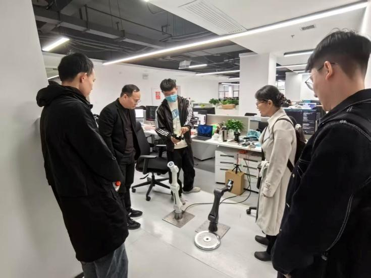会后,在孟工、赵工等的陪同下,肖锋一行参观了公司的机械臂的研发中心,现场观摩了多款机械臂产品的高精度作业演示。肖锋对公司在前沿技术领域取得的突破性成就表示高度赞赏,并亲切勉励随行学生要扎实深耕专业本领,积极投身科技创新实践。